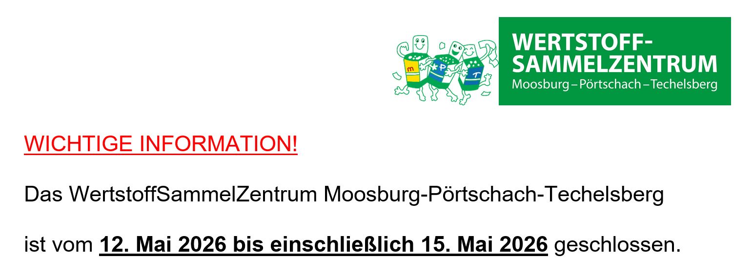 Bitte beachten Sie, dass das WertstoffSammelZentrum Moosburg–Pörtschach–Techelsberg von 12. Mai 2026 bis einschließlich 15. Mai 2026 geschlossen sein wird. In diesem Zeitraum kann daher keine Müllannahme erfolgen.
